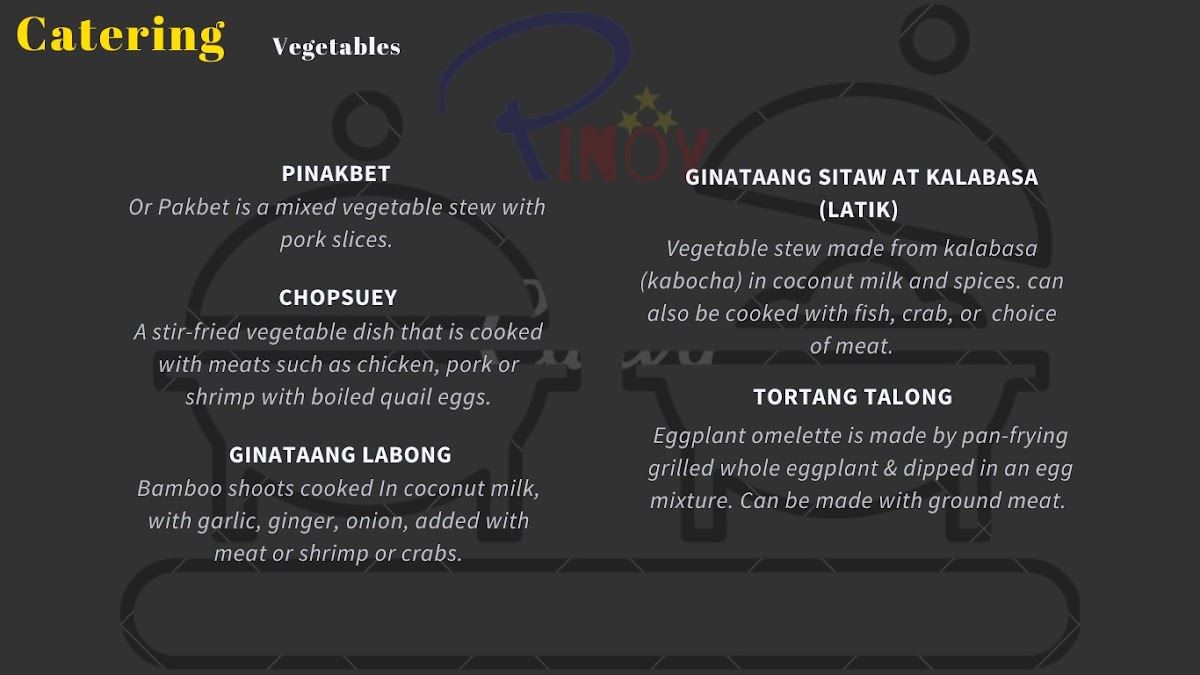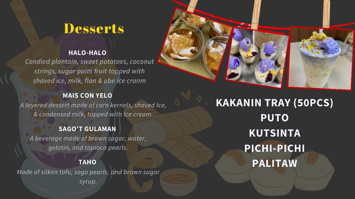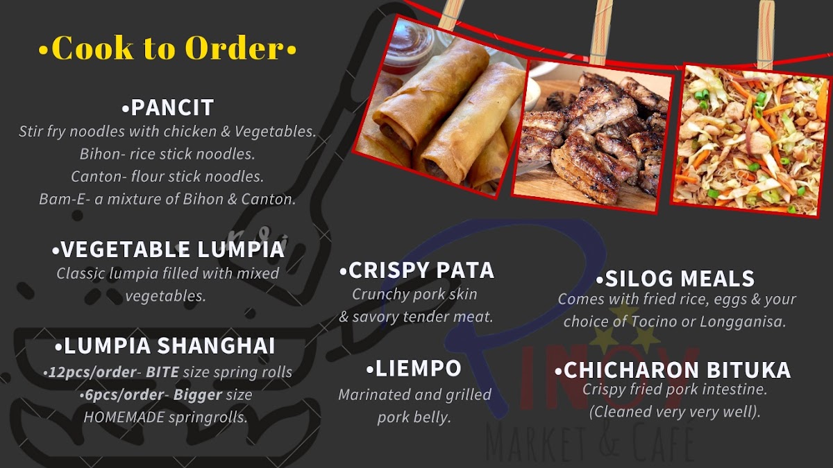 The menu at Pinoy Market & Cafe offers a delightful variety of Filipino dishes that capture the essence of traditional flavors. For entrees, you can indulge in the Combo Meal Rice & 2 Sides, which comes with a well-rounded selection, or opt for the savory Pork BBQ On Sticks or the tender Tang InasalLiempo. Another standout is the crispy Lechon Kawali, perfect for those who enjoy a rich, crispy texture. The cafe also offers classic Filipino noodles like Pancit Canton and Pancit Bihon, both known for their flavorful and satisfying stir-fried noodles. If you're in the mood for something comforting, try one of the hearty soups like Pancit Molo or Lapaz Batchoy, which are paired perfectly with rice. This well-curated menu provides a comforting taste of the Philippines with every dish.